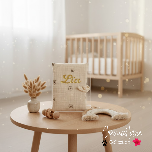 Notre protège carnet de santé en gaze de coton est entièrement fait main et personnalisable avec le prénom de votre choix.