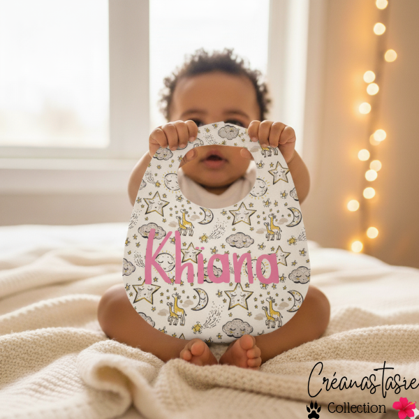 Offrez à bébé des repas tout en douceur avec ce bavoir fait main au motif céleste rempli de magie. Nuages, étoiles dorées, lunes et girafes apportent une ambiance douce, rêveuse et poétique, parfaite pour accompagner les premiers moments de vie.