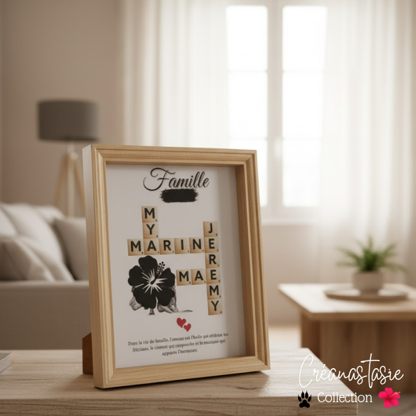 Un design chaleureux qui relie chaque membre de la famille comme un mot croisé : les prénoms s’imbriquent dans un cadre élégant, formant une belle déclaration d’amour.